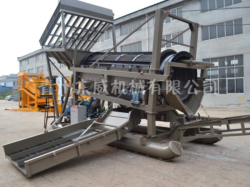 设备由料仓、滚筒筛、固定溜槽、鼓动溜槽、尾料输送机、水泵组等系统组成,通过电机或柴油机驱动滚筒筛及其他水泵系统,供水量可根据原料情况通过阀门调节水量大小。
