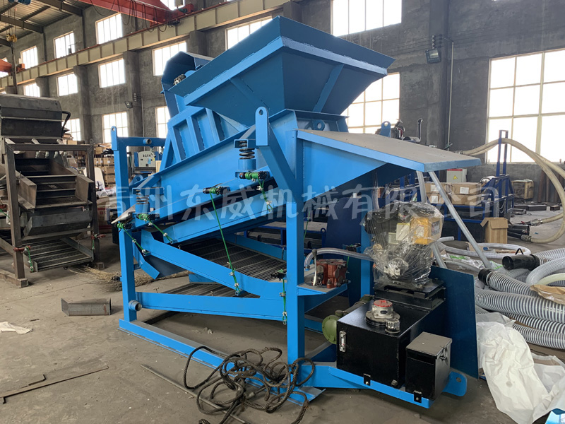 振动式选金机是一个紧凑型、可移动的整体结构。顶部为筛条部分,可以将大块物料隔除,同时物料落入二次筛分机构,充分筛分后,高压力水将沙子冲入溜槽选金。该选金机结构金紧凑、操作简单、低运行成本。明显比市场上其它选金设备有优势,无需丰富的选金经验即可操作。