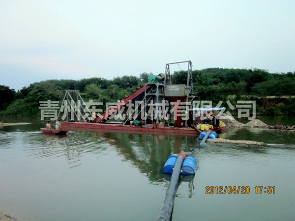 链斗式挖沙船可根据客户性能要求及工矿作业特点设计制造。物料挖掘出来并由输送机或输送泵输送至岸边、运沙船的功能;浮体采用横骨架式分体箱形结构,转运时可拆装后装车。装有定位设备、链斗挖掘装置、桥架升降装置及皮带输送机等。水下杆是由安装在浮体上的绞车实现升降,砂石料通过链斗装置挖掘上来,由输送机或输送泵输送到岸上或运沙船。