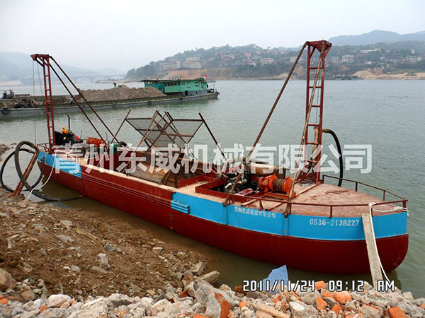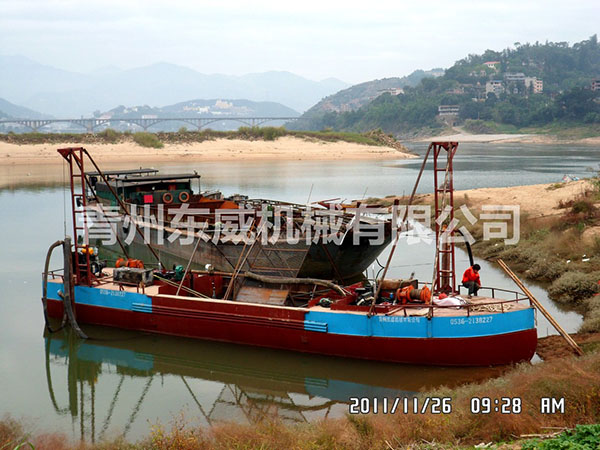 该抽沙设备主要适用于水库、河道、湖泊等宽车辆不能进入的阔水域作业,工作流程为抽沙运输船开到抽沙区域,利用抽沙船自带的抽砂系统将沙子抽进船舱,抽满船舱后运输至岸边,打开底舱门,将沙子卸到水里,再用岸边的小型抽沙机抽出并输送至码头或者直接用抽砂泵讲沙子从船舱输送至码头。该设备结构简单、工作量大、易损件少,抽出来的沙子含泥量低,无石块,沙子质量好,是近几年采沙、清淤比较常用的工具。