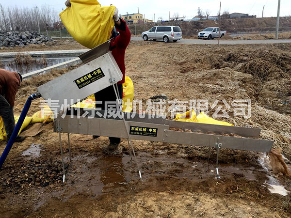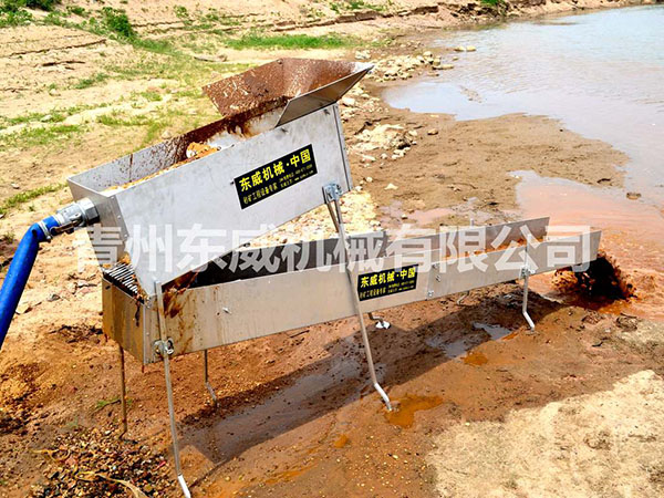 我公司开发的轻型选金溜槽,具有重量轻、处理量大、结构紧凑等优点,拆卸后可轻松装入皮卡车、面包车、SUV后备箱,方便转运、安装。配备汽油水泵,使用熟练后,只需十多分钟就可组装完毕。采用人工上料的方式,由汽油水泵提供水源,无需其他重型设备辅助,适用于地形复杂、大型车辆不易进入的山区、干旱河道,可完成探矿、小规模开采、重沙富集等工作。