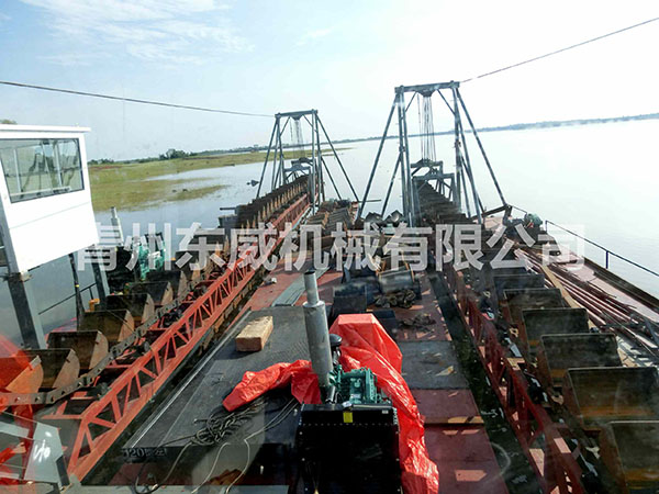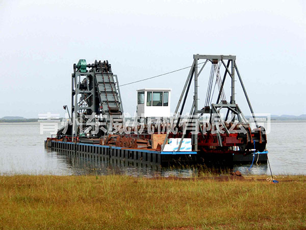 淘金船是一种集采矿作业、选矿作业为一体的水上联合工厂,是一种砂金、铁粉、锡矿、钨矿等重金属开采设备,它包括链斗挖掘系统、选矿及供水系统、废矿及尾矿排弃系统、甲板机械、船体、上部钢构、供电等几个基本系统。